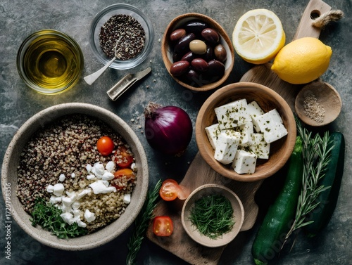 Mediterranean quinoa salad ingredients preparing for healthy meal