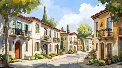 mediterranean residential illustration, pastel colored townhouses, ornamental balconies, urban garden elements, quaint european architecture, detailed facade design, cozy street atmosphere, artistic