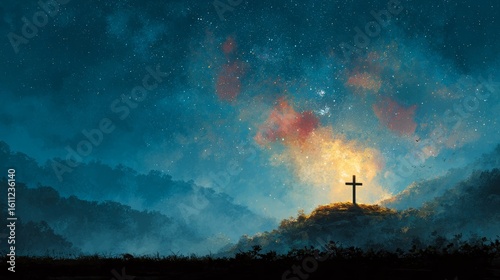 medium close-up of a cross silhouette on a blue sky background
