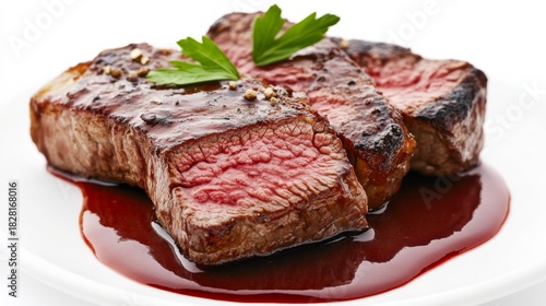 Medium Rare Sliced Steak with Red Wine Sauce and Parsley Garnish,food , gourmet