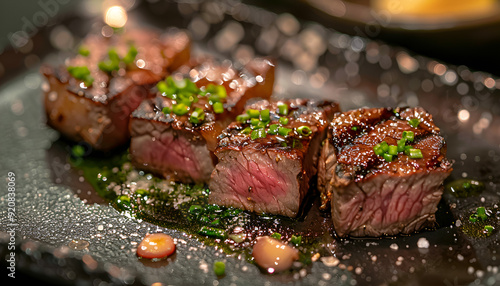 medium rare steaks, as a luxurious dish appetizingly served on the pan in five-star hotel