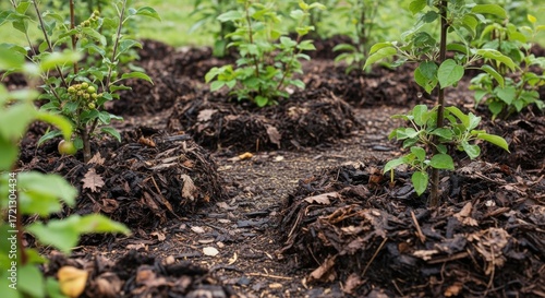Medium shot of compost mulch applied around fruit plants illustrating nutrientrich organic layering for improved soil health and moisture control.