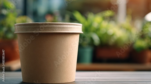 Medium shot of compostable food container made from natural fibers sharply focused with blurred ecofriendly background highlighting biodegradable packaging innovation.