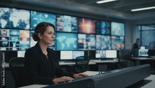 news, coordinator, monitoring, breaking, story, organised, calm, atmosphere, blurred, background, medium, shot, expansive, wall, professional, environment, focused, diligent, information, communication, technology, journalism, workspace, colours, composition, clarity, detail, calmly