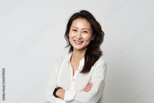 Medium shot portrait of a Chinese woman in her 30s in a white background wearing a chic cardigan