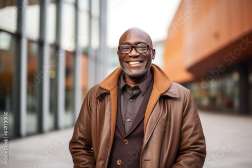 medium shot portrait of a Kenyan man in his 50s wearing a chic cardigan against a modern architectural background