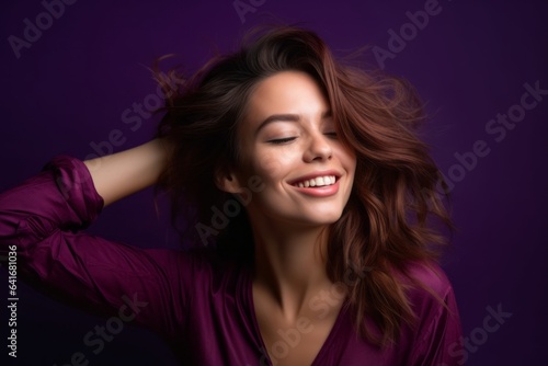 Medium shot portrait photography of a glad girl in her 30s touching her hair against a deep purple background. With generative AI technology