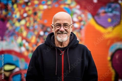 Medium shot portrait photography of a happy mature man wearing a cozy sweater against a colorful graffiti wall background. With generative AI technology