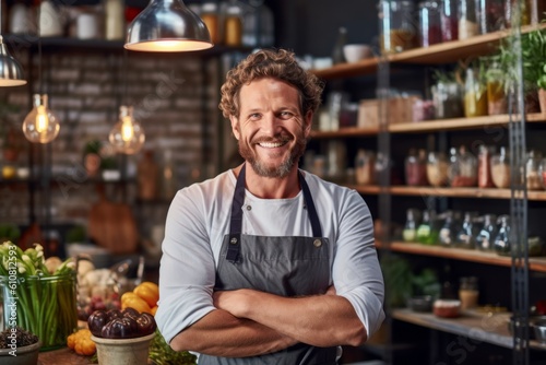 Medium shot portrait photography of a pleased man in his 30s that is wearing a chic cardigan against a well-stocked gourmet kitchen with a chef at work background . Generative AI