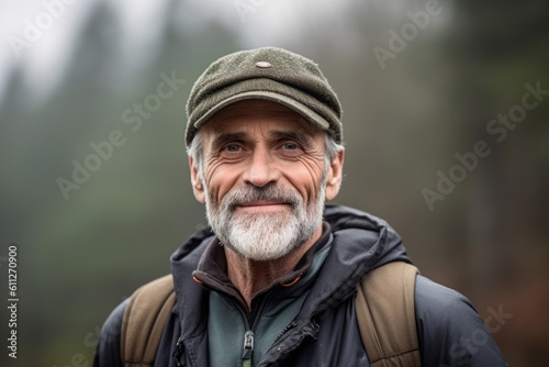 Medium shot portrait photography of a satisfied mature man wearing a cool cap or hat against a foggy forest background. With generative AI technology