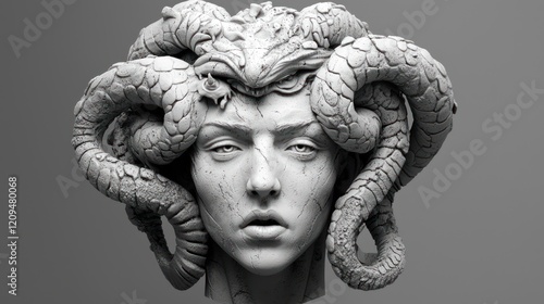 sculpture, medusa, mythology, greek, statue, snake, stone, art, three-dimensional, render, model, digital, fantasy, creature, face, woman, head, grey, monochrome, detail, texture, ancient, mythical, powerful, elegant, artistic, intricate, masterpiece, sophisticated, realistic, classic, legend, myth, symbol, occult, creepy, dark, horror