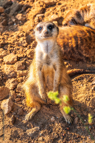 Meerkat, Suricata suricatta, on hind legs. Portrait of meerkat standing on hind legs with alert expression. Portrait of a funny meerkat sitting on its hind legs.