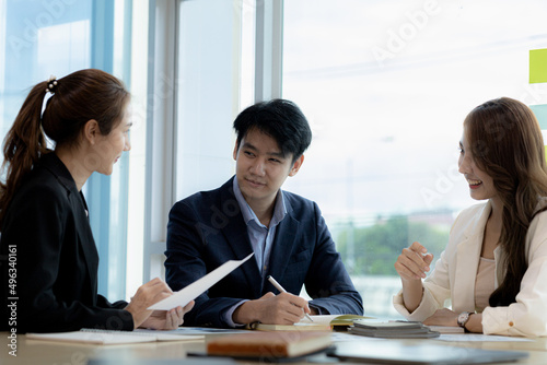 Meeting room atmosphere and business groups are meeting, discussing and planning business operations for more profitable growth. Concept of business meeting and company administration.