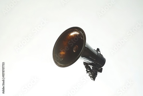 megaphone, perspective, below, balanced, lighting, studio, white, background, audio, communication, announcement, sound, equipment, rally, concert, event, public, voice, loudspeaker, metal, object, technology, modern, design, minimal, isolated, air, abstract, creative, shape, device, hand-held, tool, art, clear, aesthetic, professional, dynamic, high-coloured, sharpened, angle, photo, sharp, contrast, vibrant, image, visual