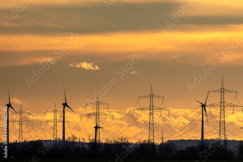 Mehrere Windkraftanlagen und Strommasten stehen vor einem intensiv orangefarbenen Himmel, der durch die untergehende Sonne beleuchtet wird.