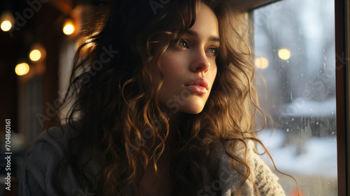 Melancholic Young Caucasian Woman with long red hair looking outside far away through a windows with a blurry background