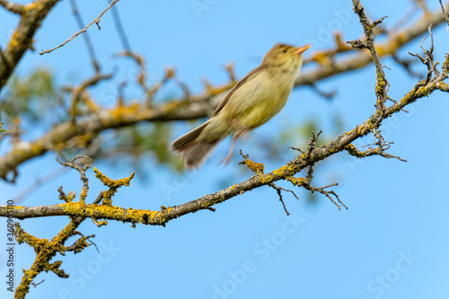 Melodious warbler on a branch - cute small yellow bird