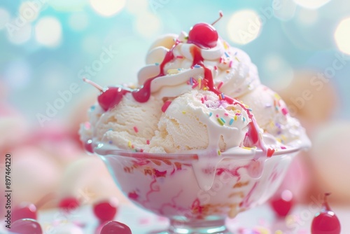 Melting ice cream sundae, nostalgic summer treat, with copy space