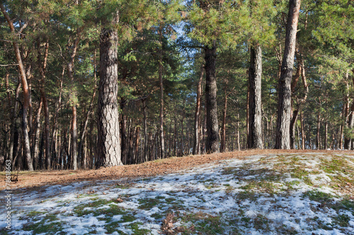 Melting snow on clearing in pine forest at early spring