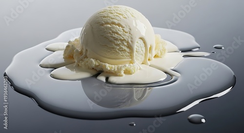 "Melting vanilla ice cream scoop on glossy black surface, creamy puddle, close-up food photo, dramatic light"