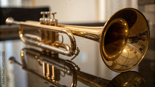 memorial day Close up of brass trumpet reflecting light on glossy surface, showcasing its intricate design and craftsmanship. image captures elegance and artistry of this musical instrument