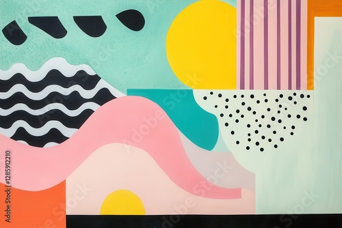 memphisstyle abstract composition with pastel waves playful geometric shapes and dotted patterns in soft retro colors
