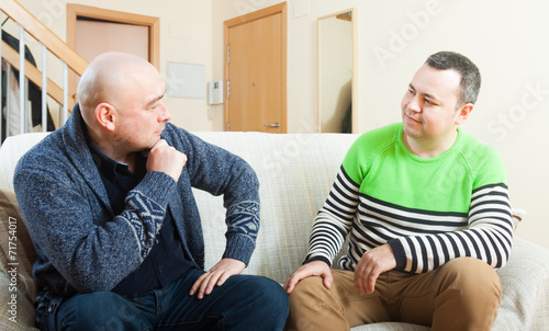 man, talking, home, people, 2, friends, man, family, happy, adult, group, retirement, portrait, person, discussion, together, smiling, lifestyle, male, discussing, mature, friendship, 2, inside, indoor, room, talk, sitting, caucasian, relaxed, 30s, 40s