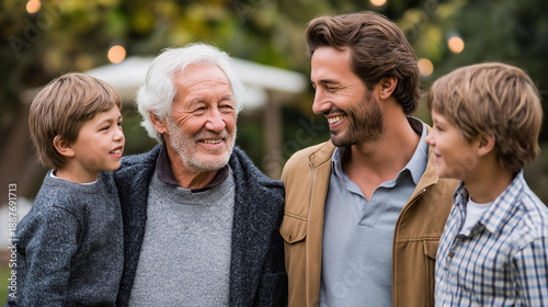 Men from different generations smiling at each other, warm family values backdrop, charitable initiatives imagery, intergenerational bonding, male relationship across ages,
