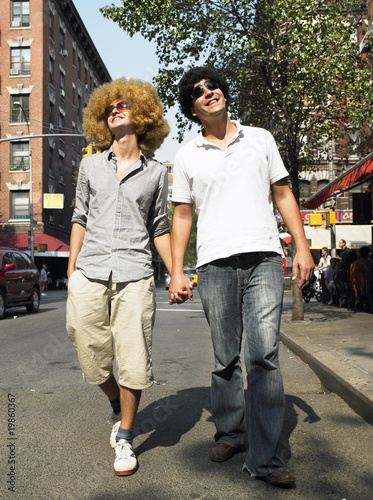 2, 20s, absurd, adult, afro, casual clothes, caucasian, cheerful, city, city landscape, full-length, funny, happiness, happy, holding hands, humor, individuality, joking, leisure, leisure time, lifestyle, male, man, man, mischief, outdoors, outside, people, playful, playing, recreation, recreational activity, sidewalk, smile, smiling, 20s, 2, urban, vertical, white