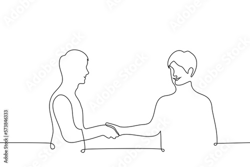 men smiling shaking hands - one line drawing vector. concept pleasant meeting or acquaintance