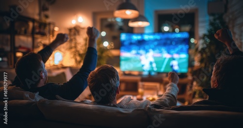 Men watch an exciting game on TV in a softly lit living room, cheering with raised fists, showcasing friendship and shared enthusiasm