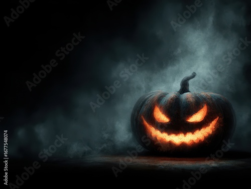 Menacing Jack-o-Lantern - Glowing Halloween Pumpkin in Smoky Darkness.