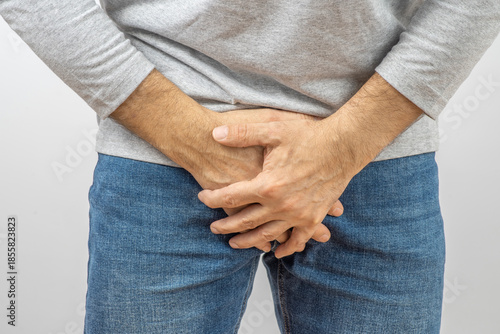 Men's health concept. Man holding his lower abdomen, suffering from pain or cramping.
