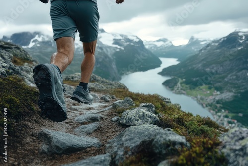 Men's legs in sports shoes and a backpack, running along a mountain path with breathtaking views ahead