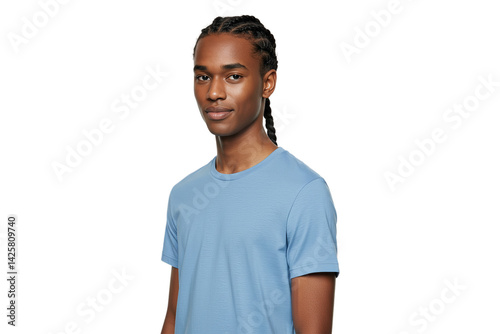 male, man, guy, person, adult, model, portrait, face, head, hair, coiffure, braid, skin, complexion, eye, nose, lip, ear, neck, shoulder, clothing, shirt, t-shirt, crew, sleeve, short, blue, light, fabric, cotton, casual attire, wear, fashion, style, apparel, clothes rack, design, trend, modern, simple, plain, youth, young, cool, confident, looking, indoor, studio, posing