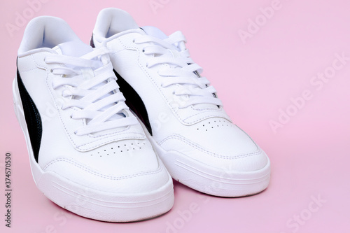 Mens sneakers on a pink background.