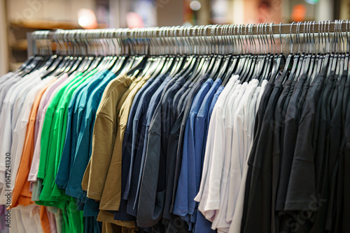 Men's t-shirts on a hanger in a clothing store in a shopping mall.