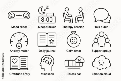 mental, health, wellness, icon, therapy, sleep, anxiety, journal, calm, support, group, gratitude, mind, stress, emotion, cloud, tracker, session, talk, bubble, slider, meter, daily, entry, timer, bar, zzz, symbol, meditation, communication, relaxation, vector, icon