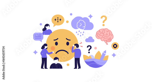 flat, mental, health, awareness, emotion, character, cartoon, icon, depression, anxiety, stress, brain, question, cloud, rain, sad, therapy, communication, people, care, support, wellness, understanding, mind, psychology, feeling, concept, help, inspiration, healing, empathy, community, balance, resilience, challenge, illustration