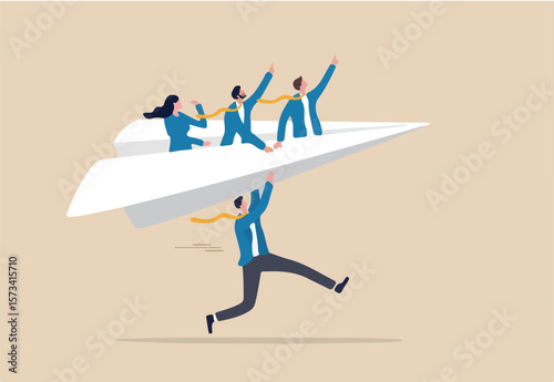 Mentor or support employee to success, manager to help or advice staff to reach goal, work coaching or adviser expert concept, businessman manager launching paper plane origami with team colleagues
