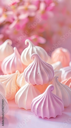 Meringue kisses in a delicate arrangement, soft pastel background, wide angle, fresh to Adobe , golden hour lighting
