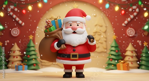 christmas, santa, claus, holiday, festive, cheerful, jolly, gift, present, bag, sack, snow, light, tree, decoration, happy, merry, red, white, cartoon, three-dimensional, rendering, illustration