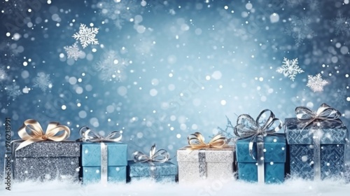 Merry Christmas and Happy Holidays greeting card, frame, banner. New Year. Noel. Christmas gift on blue background top view. Winter xmas holiday theme.