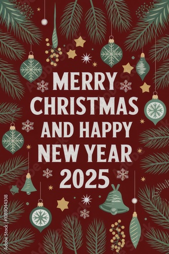 Merry christmas and happy new year 2025 greeting card with festive ornaments and pine branches