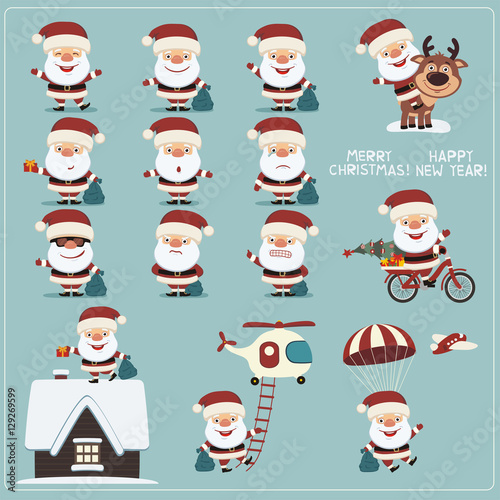 Merry Christmas and Happy New Year! Big set funny Santa Claus in different poses.