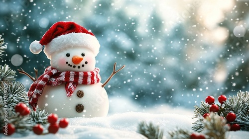 Merry Christmas and Happy New Year Greeting Card with Copy Space Featuring a Happy Snowman in a Christmas Landscape and Snowy Winter Fairytale Background