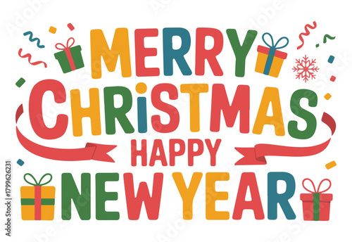 merry christmas, happy new year, lettering, greeting card, festive, vector, illustration, holiday, celebration, christmas, new year, christmas, design, typography, text, colourful, gift, present, ribbon, snowflake, confetti, season, december, winter, party, event, decoration, graphic, card, banner, poster, invitation, isolated on white, clip art