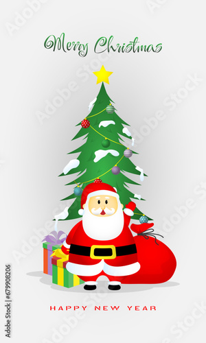 Merry Christmas and New Year poster with Santa Claus standing in front of the Christmas tree