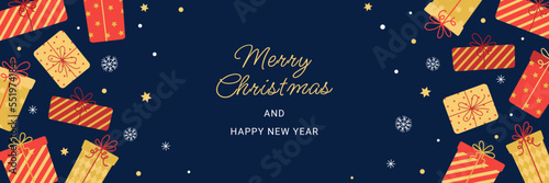Merry Christmas banner, greeting card. Festive horizontal background with falling gift boxes, confetti and snowflakes. Christmas vector design