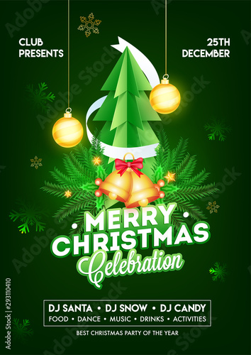 Merry Christmas Celebration template or flyer design with paper cut xmas tree, jingle bell, pine leaves and hanging baubles decorated on green background.
